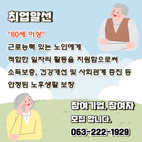 - 참여자는 만 60세 이상(재정지원 일자리사업에 참여중인자, 고용보험에 가입되어있는자 등 제외)