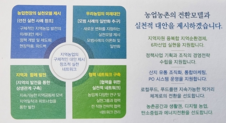 22년간 농업·농촌·농민의 문제를 고민하고 구체적 대안을 제시하기 위한 연구, 컨설팅, 교육 등의 다양한 분야의 사업을 추진