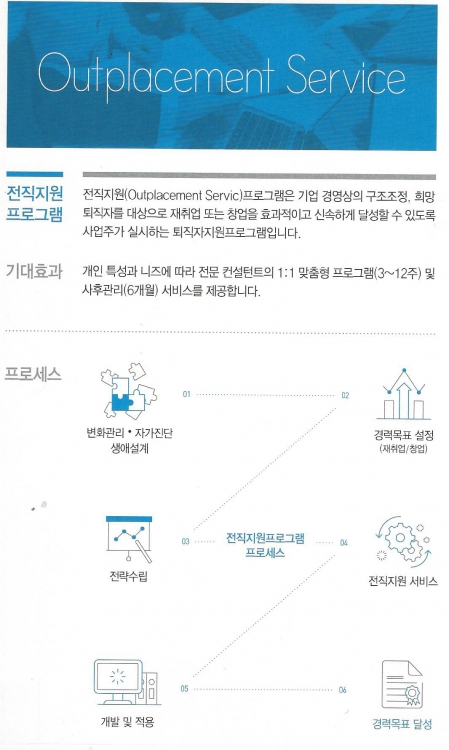 기업구조조정 희망퇴직자를 대상으로 재취업 또는 창업을 효과적이고 신속하게 달성할 수 있도록 하는 서비스 퇴직자 지원 프로그램