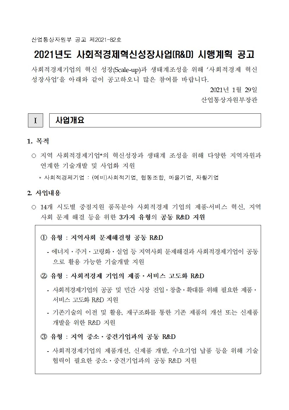[산업통상자원부]「2021년 사회적경제혁신성장사업(R&D) 시행계획」 공고