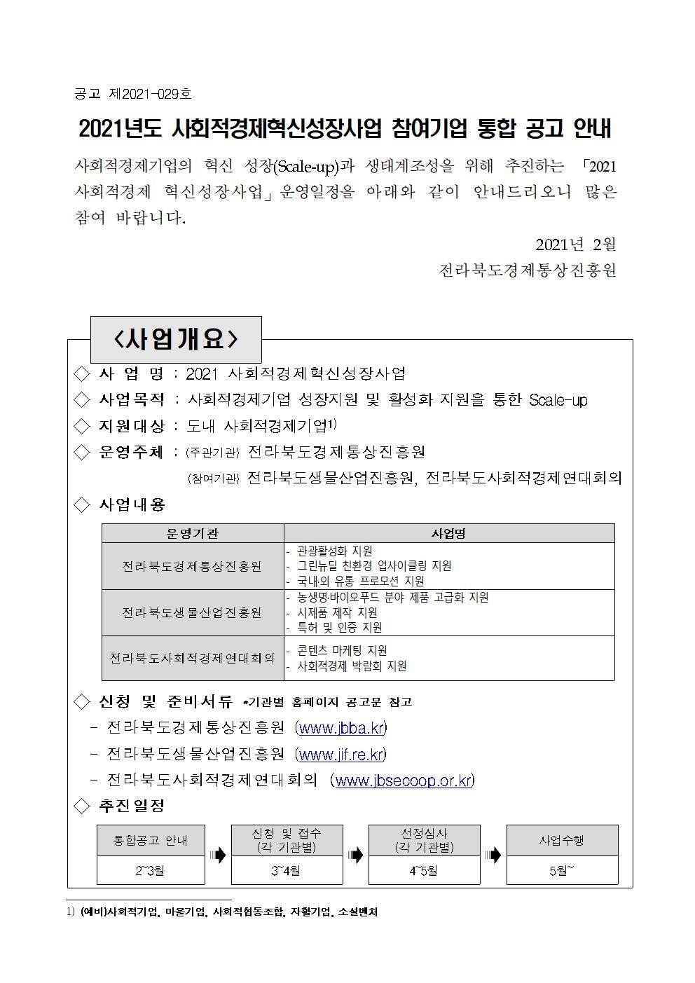 [전라북도경제통상진흥원] 2021년 사회적경제혁신성장사업 참여기업 통합공고 안내 페이지 정보 작성자 전주소통협력센터 댓글 0건 조회 1,655회 작성일 21-02-23 16:56 목록 첨부파일 2021년 사회적경제혁신성장사업 통합 공고 안내.hwp (72.0K) 2021-02-23 16:57:19 본문    ※원문 참고 링크http://www.jbba.kr/bbs/board.php?bo_table=sub01_09&wr_id=563  이전글[한국사회적기업진흥원] 2021년 (예비)사회적기업 협업활성화 지원 컨설팅 신청 공고 21-02-25 다음글[한국사회적기업진흥원] 2021년 (예비)사회적기업 협업활성화 지원 컨설팅 신청 공고 21-02-22