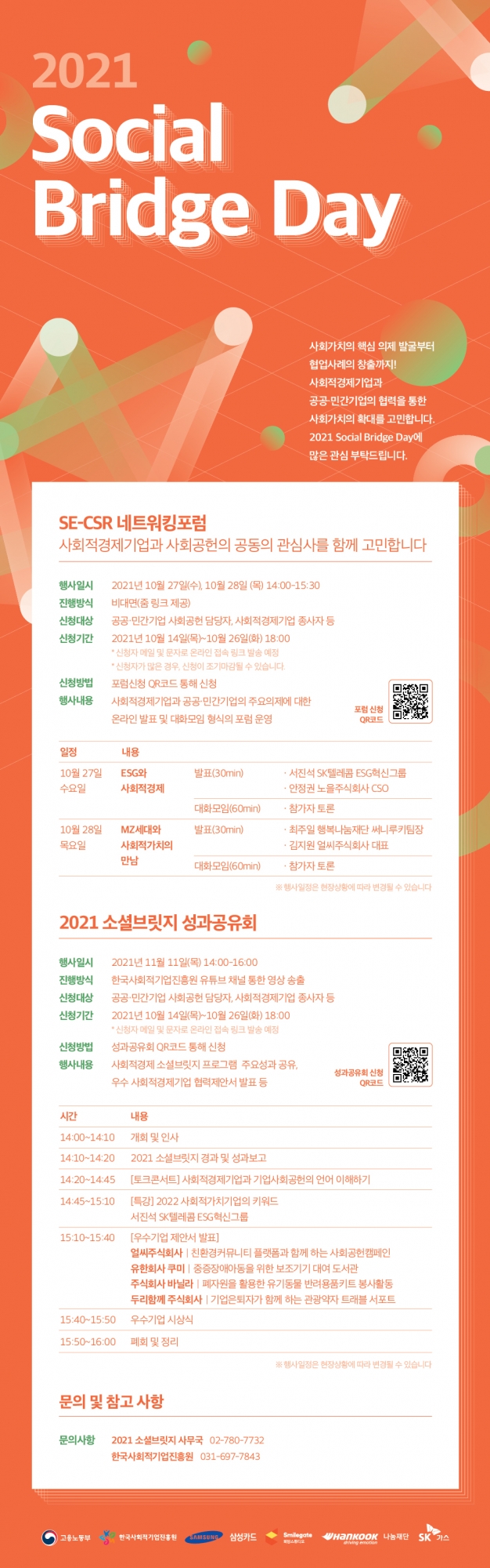 ■ 문의처: 2021 소셜브릿지 사무국(02-780-7732), 한국사회적기업진흥원 자원연계팀(031-697-7843)