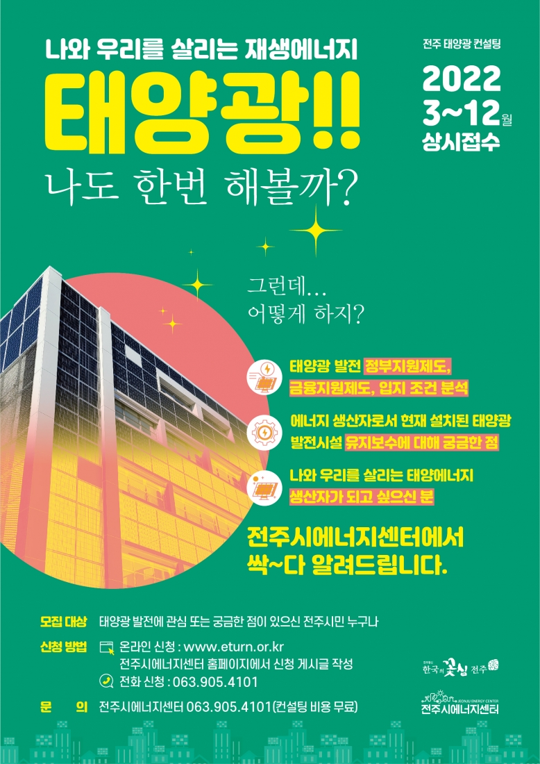 [전주시에너지센터] 2022년도 전주시 도시 태양광 컨설팅(~12월 상시접수) 페이지 정보 작성자 전주소통협력센터 댓글 0건 조회 878회 작성일 22-03-14 15:24 목록 본문  ※원문 참고 링크컨설팅 신청 공고 바로가기 이전글[전북경제통상진흥원] 2022년 사회적경제 성장기업 육성사업 공고(~4.6) 22-03-16 다음글[전북행복한돌봄사회적협동조합] 「2022년 신중년 사회공헌활동 지원사업」 참여자 모집 공고(~3.18일 금요일) 22-03-08