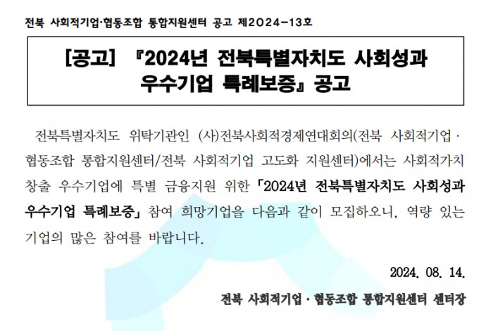 [전북사회적경제연대회의]『2024년 전북특별자치도 사회성과 우수기업 특례보증』공고(8.14~예산 소진시) 페이지 정보 작성자 전주소통협력센터 댓글 0건 조회 557회 작성일 24-08-14 13:47 목록 첨부파일 『2024년_전북특별자치도_사회성과_우수기업_특례보증』공고문.pdf (227.7K) 2024-08-14 13:47:04 본문 관련링크 http://www.jbsecoop.or.kr/bbs/board.php?bo_id=notice03&wr_id=2622 267회 연결 이전글[(재)중소상공인희망재단] 희망재단과 오픈놀이 함께하는 <2024 허브품평회> 참가자 모집(~9/6까지) 24-08-19 다음글[MYSC] 제8회 소셜벤처 혁신경연대회 모집안내(~8/21(수) 오후6시)_최대 2,000만원 지원 24-08-09
