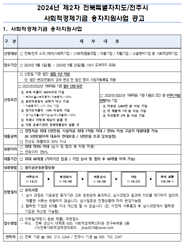 [전북사회적경제연대회의][공고]2024년 제2차 전북특별자치도/전주시 사회적경제기금 융자지원사업 공고(~9.23(월) 18시) 페이지 정보 작성자 전주소통협력센터 댓글 0건 조회 658회 작성일 24-09-02 13:19 목록 첨부파일 2024년_2차_전북전주_사회적경제기금_공고_및_신청서.hwp (100.5K) 2024-09-02 13:19:53 본문 관련링크 http://www.jbsecoop.or.kr/bbs/board.php?bo_id=notice03&wr_id=2628 251회 연결 이전글[전북특별자치도] 2024 전북특별자치도 청년축제 '청년나래' 개최 24-09-03 다음글[전주지속가능발전협의회]기린대로 BRT 시민대토론회 24-08-30