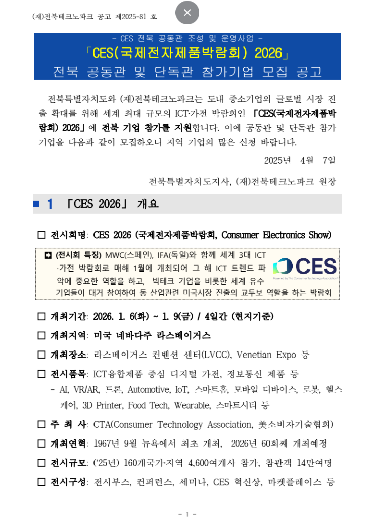[전북테크노파크] CES(국제전자제품박람회) 2026 전북 공동관 및 단독관 참가기업 모집 공고
