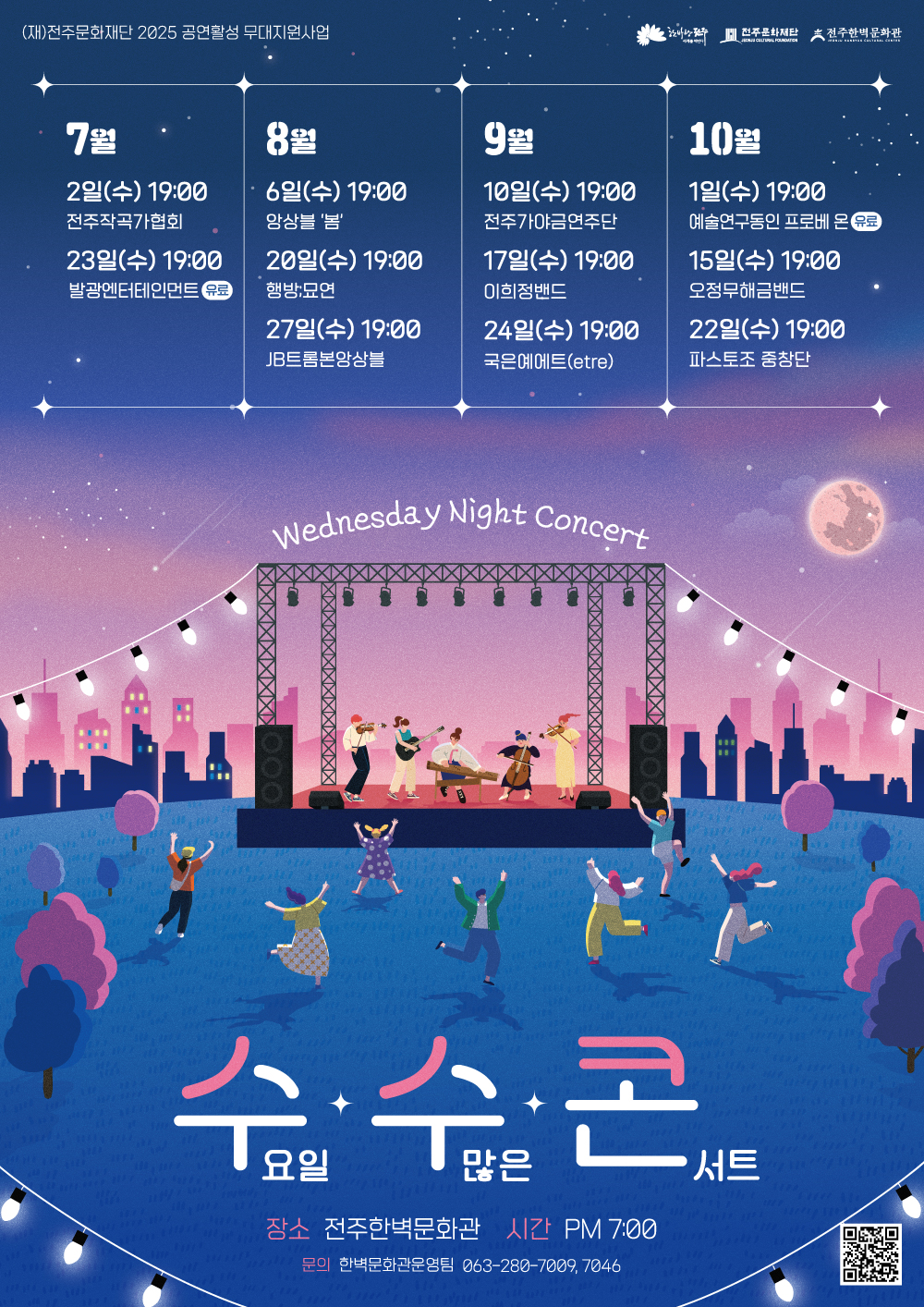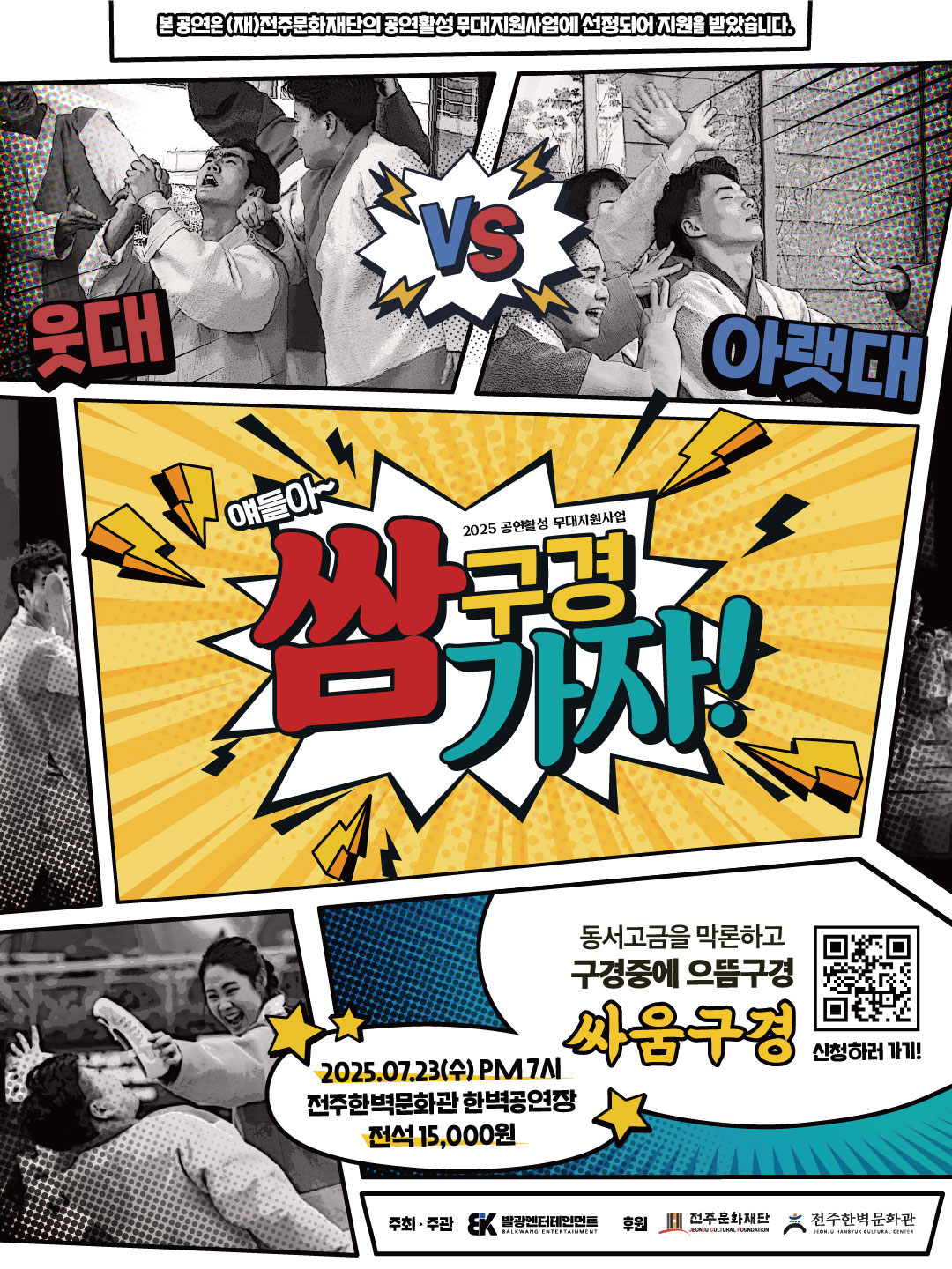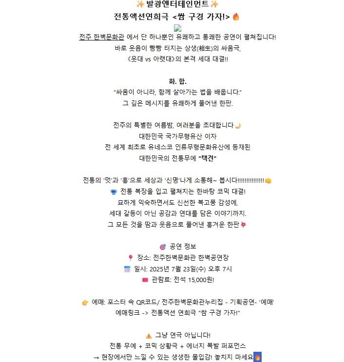 [전주한벽문화관] '수'요일 '수'많은 '콘'서트_7월 23일(수) 19시_전통액션연희극 <쌈 구경 가자!> 페이지 정보 작성자 전주소통협력센터 댓글 0건 조회 396회 작성일 25-07-17 21:24 목록 본문 이전글[전주시에너지센터] 도심태양광 분산에너지 포럼 25-07-21 다음글[전북창조경제혁신센터] 2025 J-Curve 도약지원사업 입점지원 참여기업 모집 안내 25-07-17