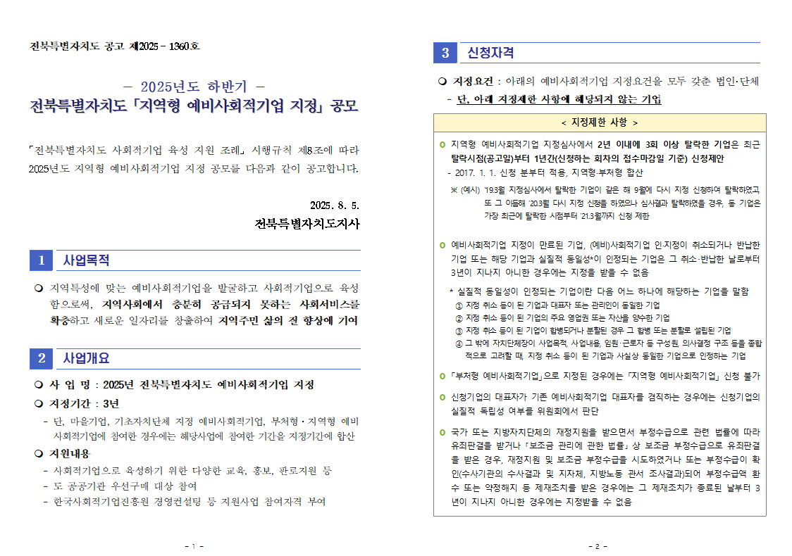 [전북특별자치도] 2025년 하반기 「지역형 예비사회적기업」 지정 공고
