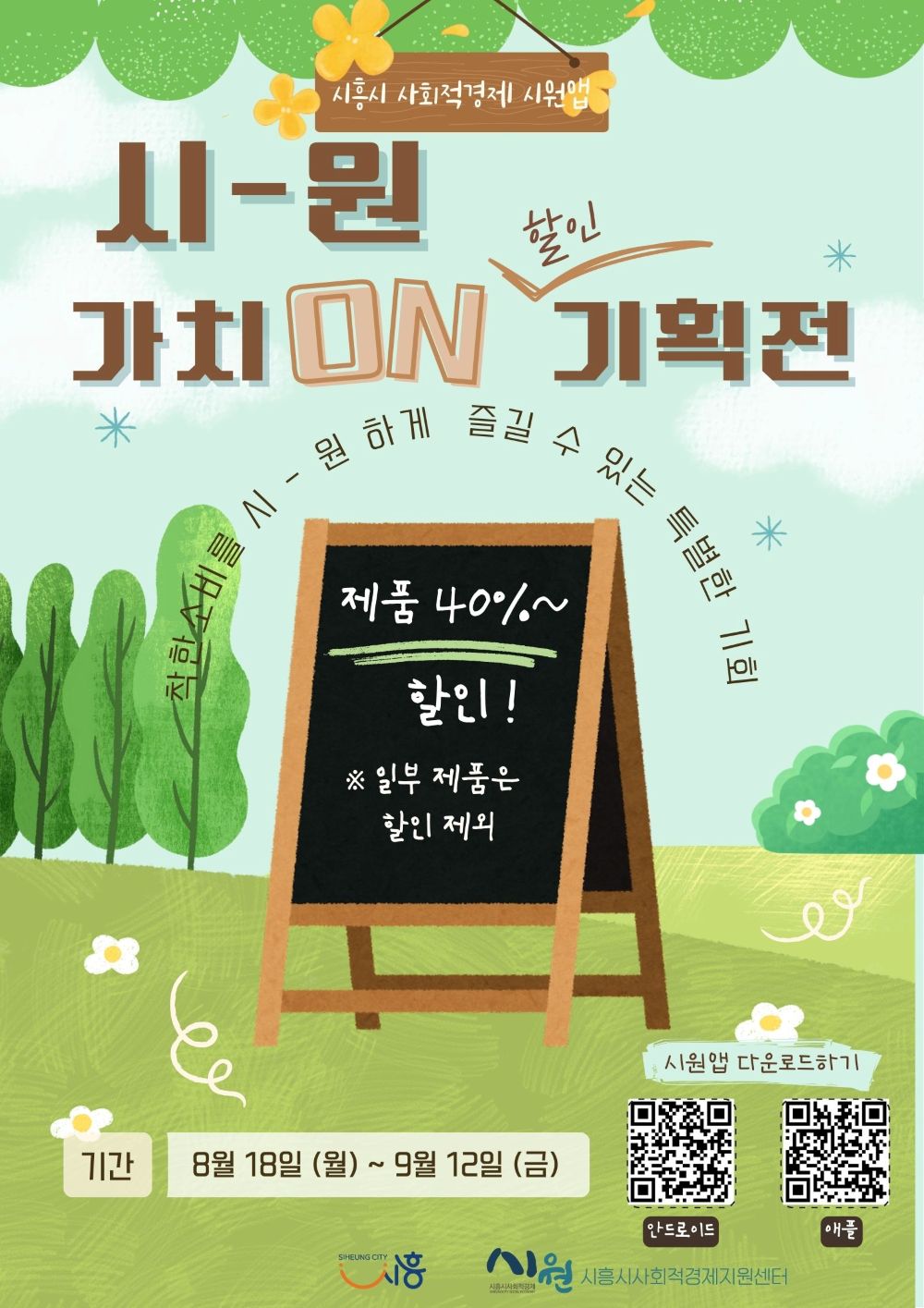 시흥시 사회적경제 모바일 플랫폼 [시원앱]에서 「가치ON 할인 기획전」이 진행됩니다.