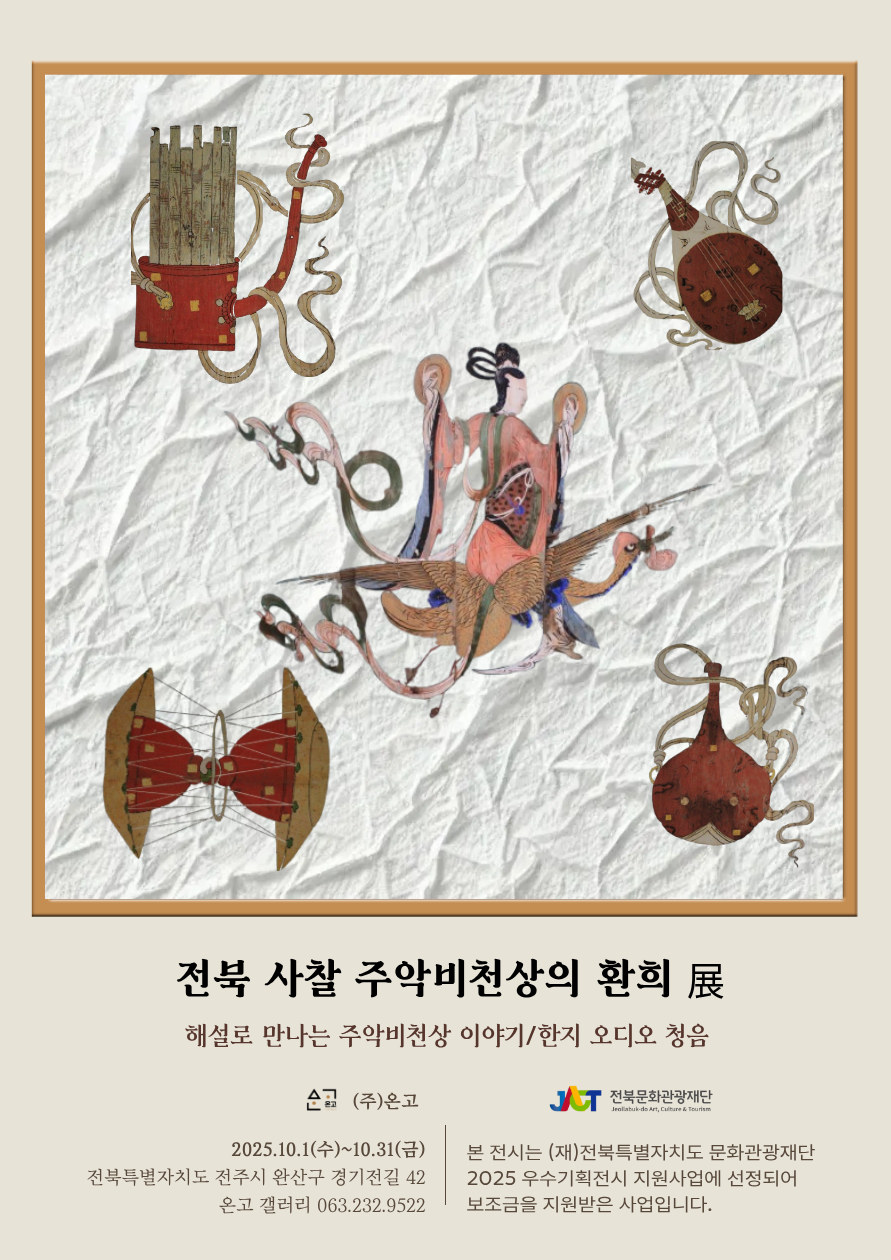 [온고] 전북 사찰 주악비천상의 환희 展 페이지 정보 작성자 전주소통협력센터 댓글 0건 조회 326회 작성일 25-09-16 15:36 목록 본문 이전글[한국사회투자] 공익법인의 다음 10년, 임팩트투자로 답하다 25-09-22 다음글[전주정보문화산업진흥원] AI·가상융합 콘텐츠 및 아이디어 공모전 25-09-15