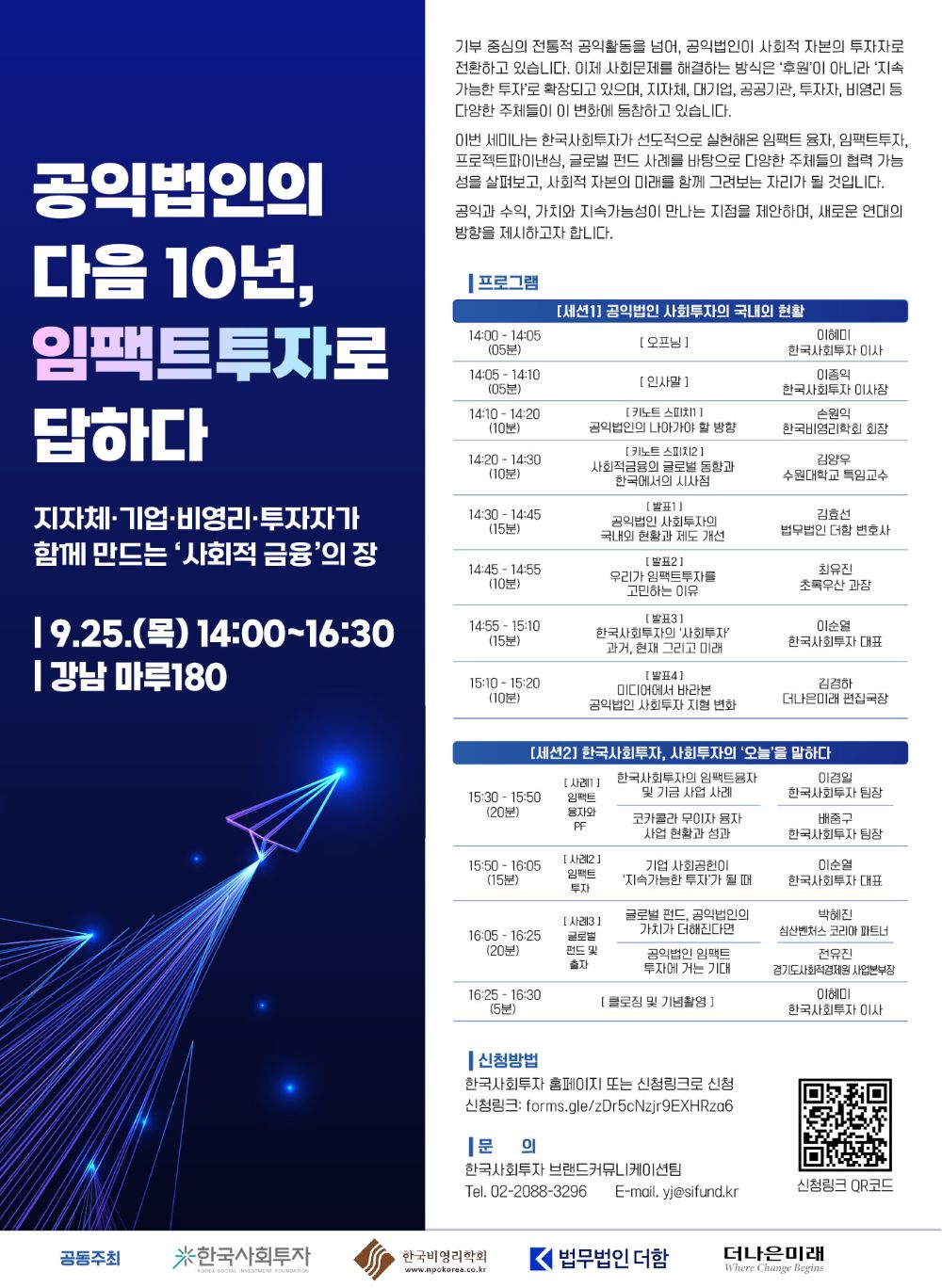 한국사회투자가 한국비영리학회, 법무법인 더함, 더나은미래와 함께 공익법인의 미래를 모색하는 자리인 「공익법인의 다음 10년, ‘임팩트투자’로 답하다」 세미나를 개최합니다.