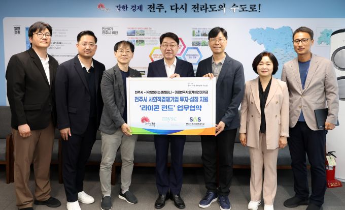 전주시가 27일 펀드 운용사인 엠와이소셜컴퍼니, 한국사회가치연대기금과 사회적경제기업 투자·성장을 지원하는 라이콘 펀드 업무협약을 체결했다.