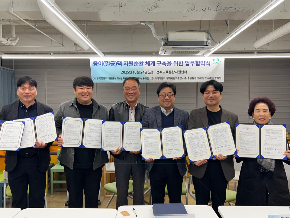 이들 기관은 지난 24일 전주교육통합지원센터에서 열린 '제7회 대한민국 사회적경제 박람회'’ 기간 중 '종이(멸균)팩 자원순환 체계 구축을 위한 업무협약(MOU)'을 체결하고 본격적인 협력에 돌입했다.